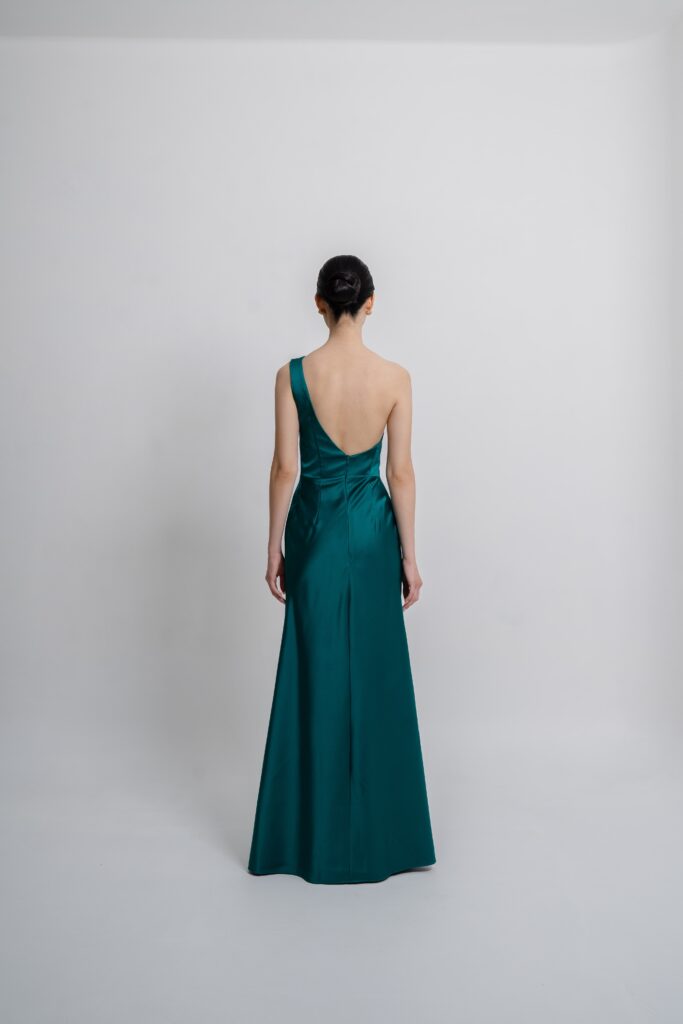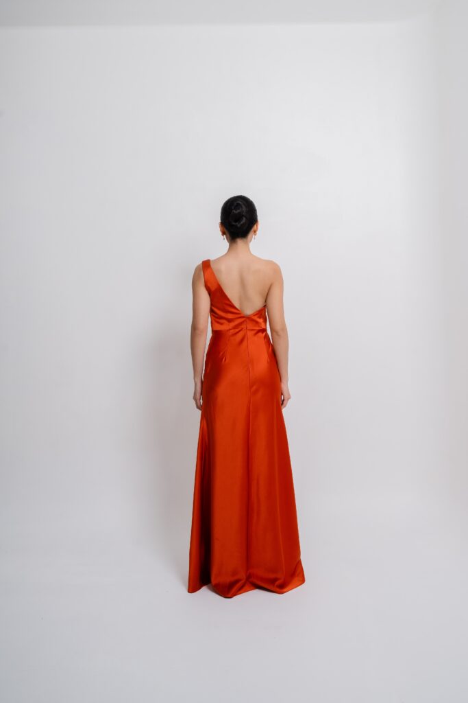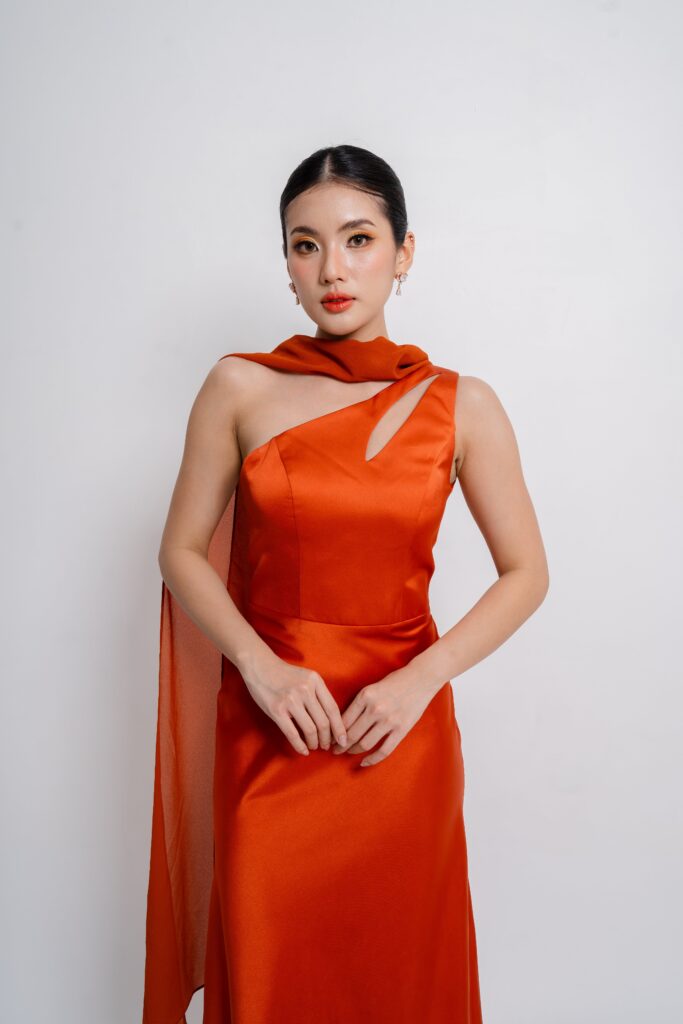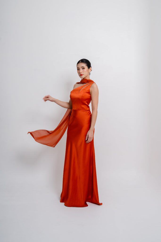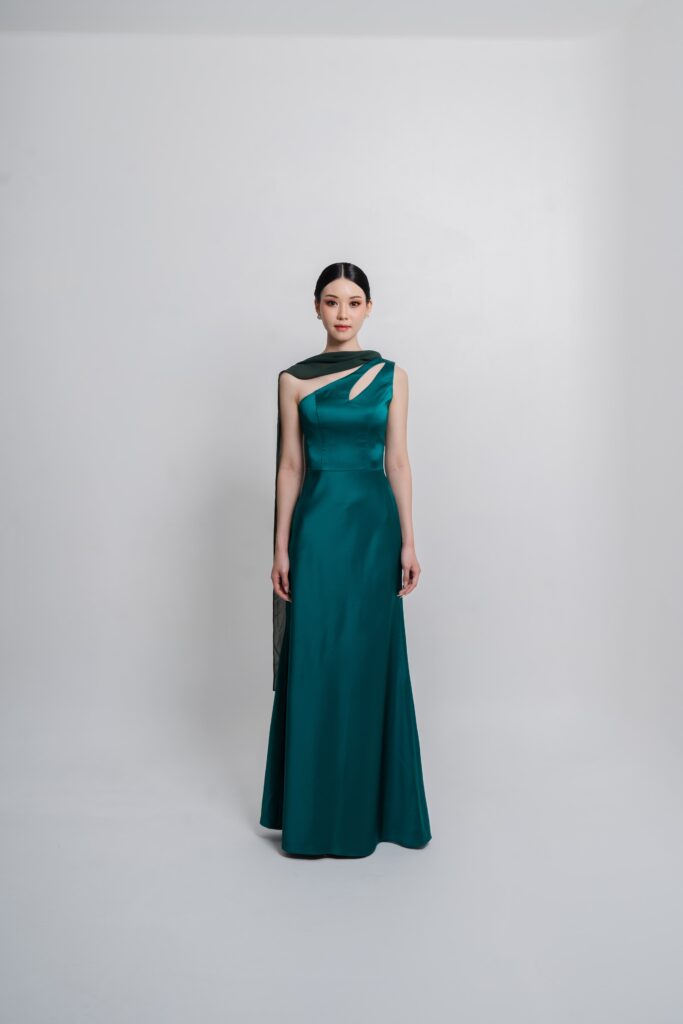 Satin toga dress with a sleek cutout and detachable scarf detail. A modern twist on classic draping that shifts effortlessly from chic to statement. Choose your preferred brilliant shade.
