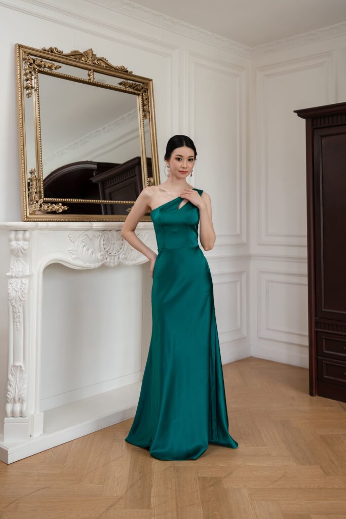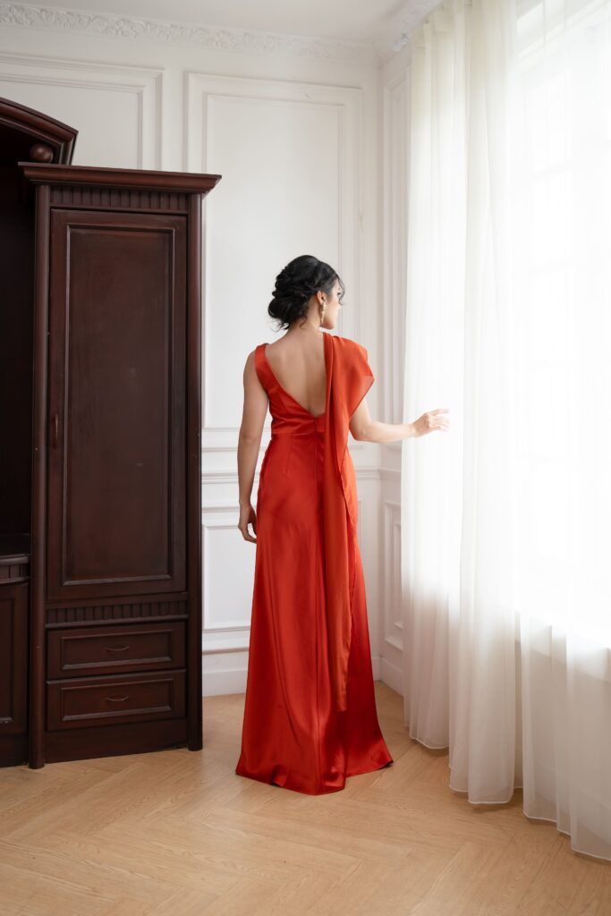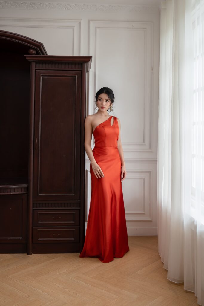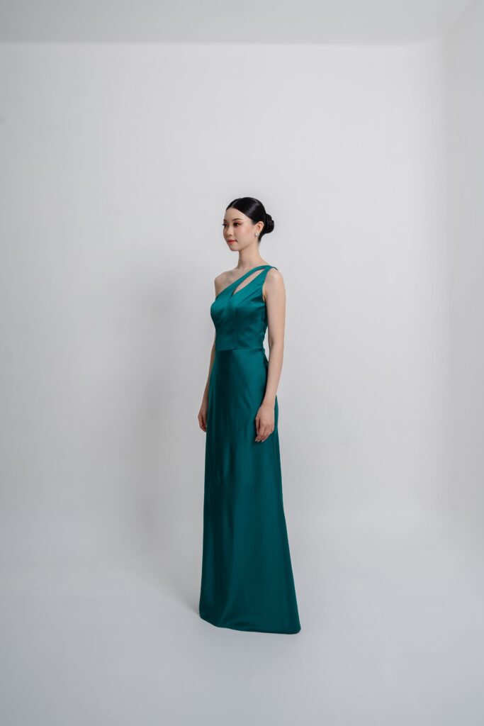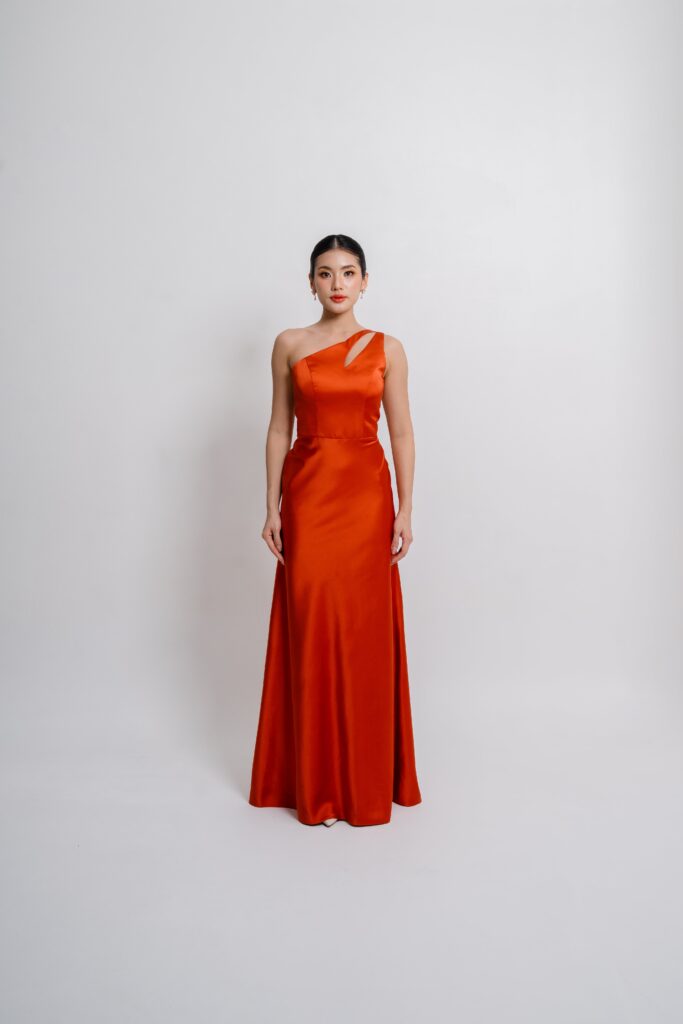 Satin toga dress with a sleek cutout and detachable scarf detail. A modern twist on classic draping that shifts effortlessly from chic to statement. Choose your preferred brilliant shade.