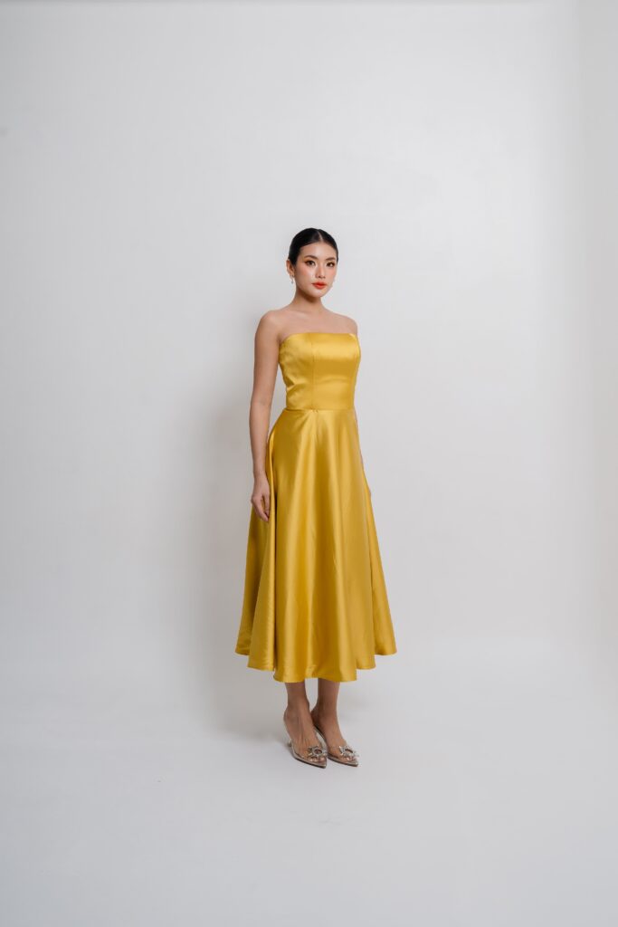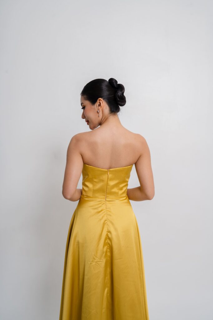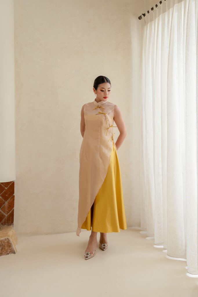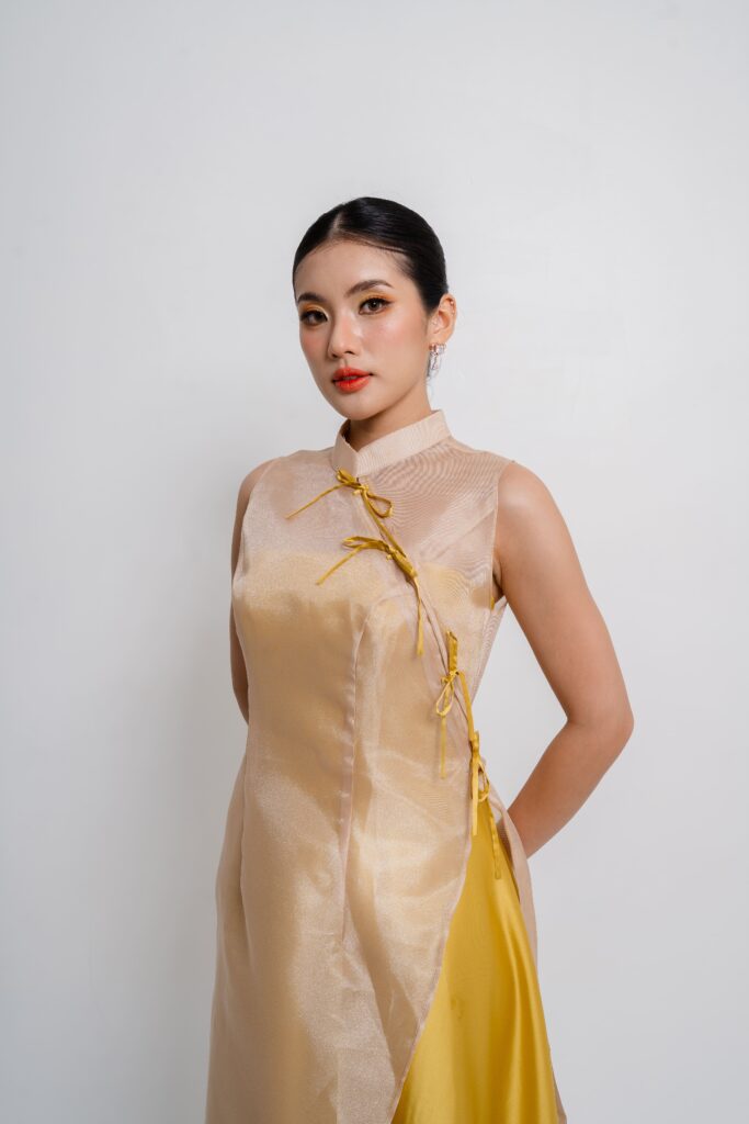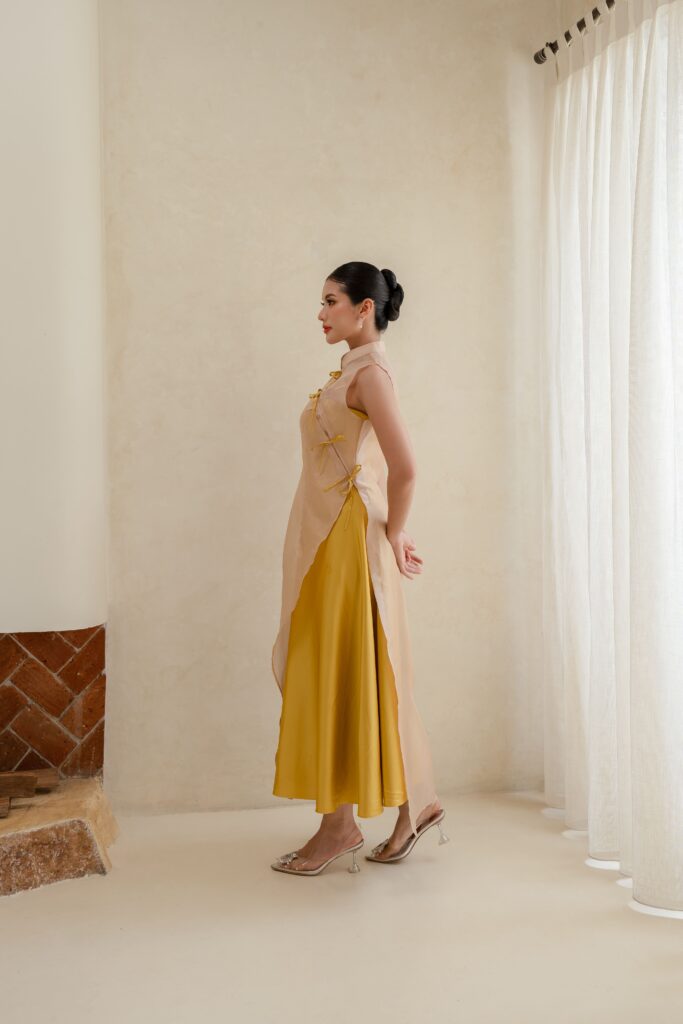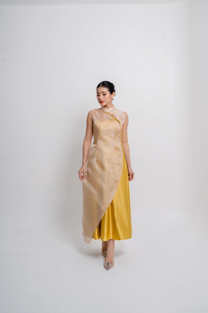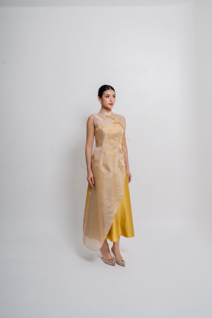 Tailored gold organza vest over a strapless silky satin underdress that flows effortlessly, worn as a set or styled individually. Choose between traditional jade buttons or satin ribbons for a romantic finish.