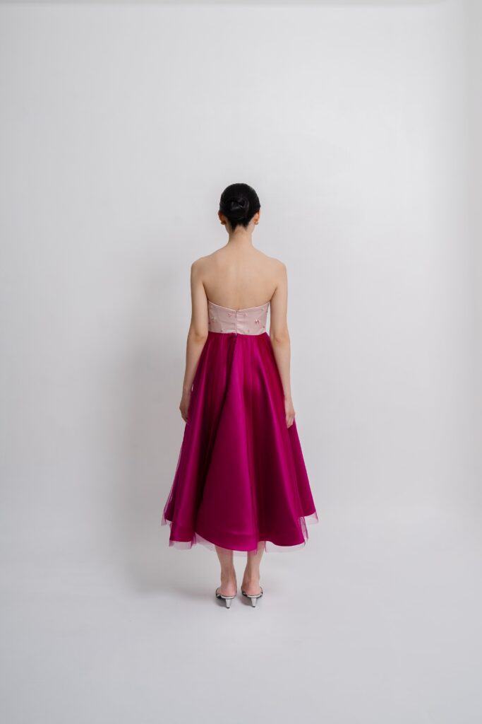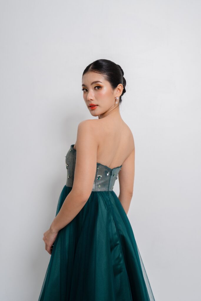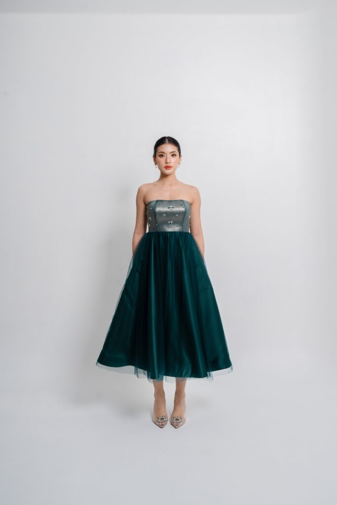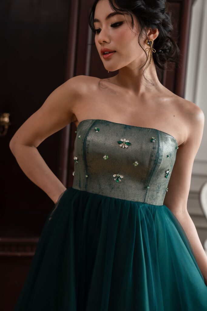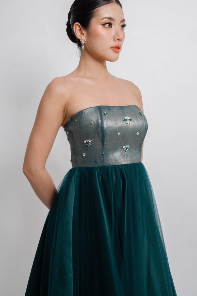 Hand embellished bustier set against a contrasting soft tulle skirt. This dress balances structured sparkle with airy elegance for a statement look. Choose between two brilliant jewel tones.