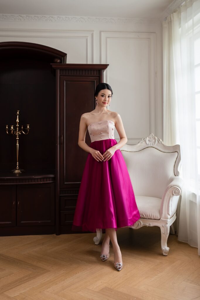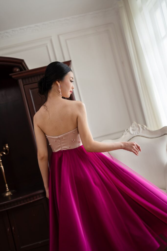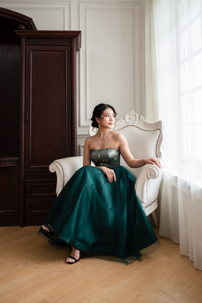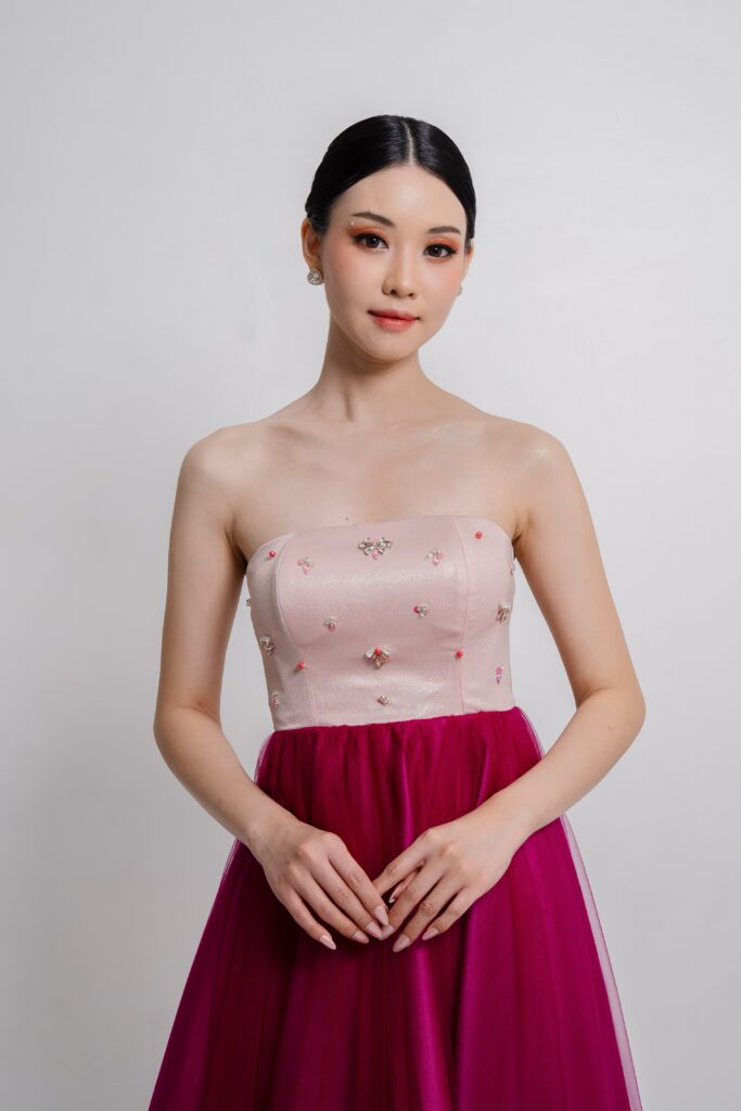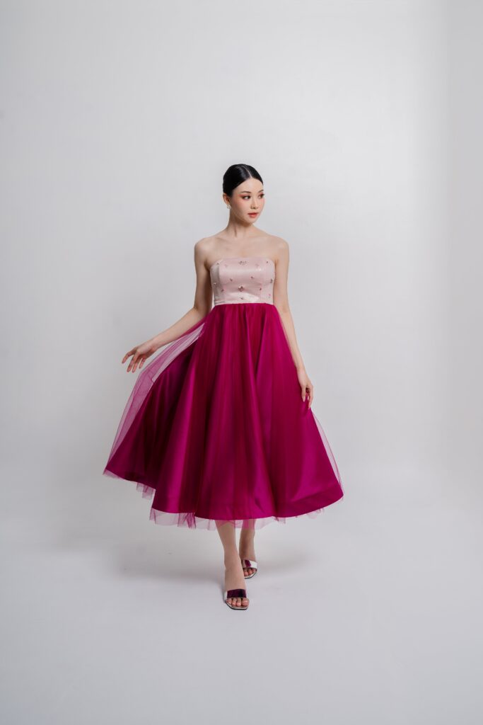Hand embellished bustier set against a contrasting soft tulle skirt. This dress balances structured sparkle with airy elegance for a statement look. Choose between two brilliant jewel tones.